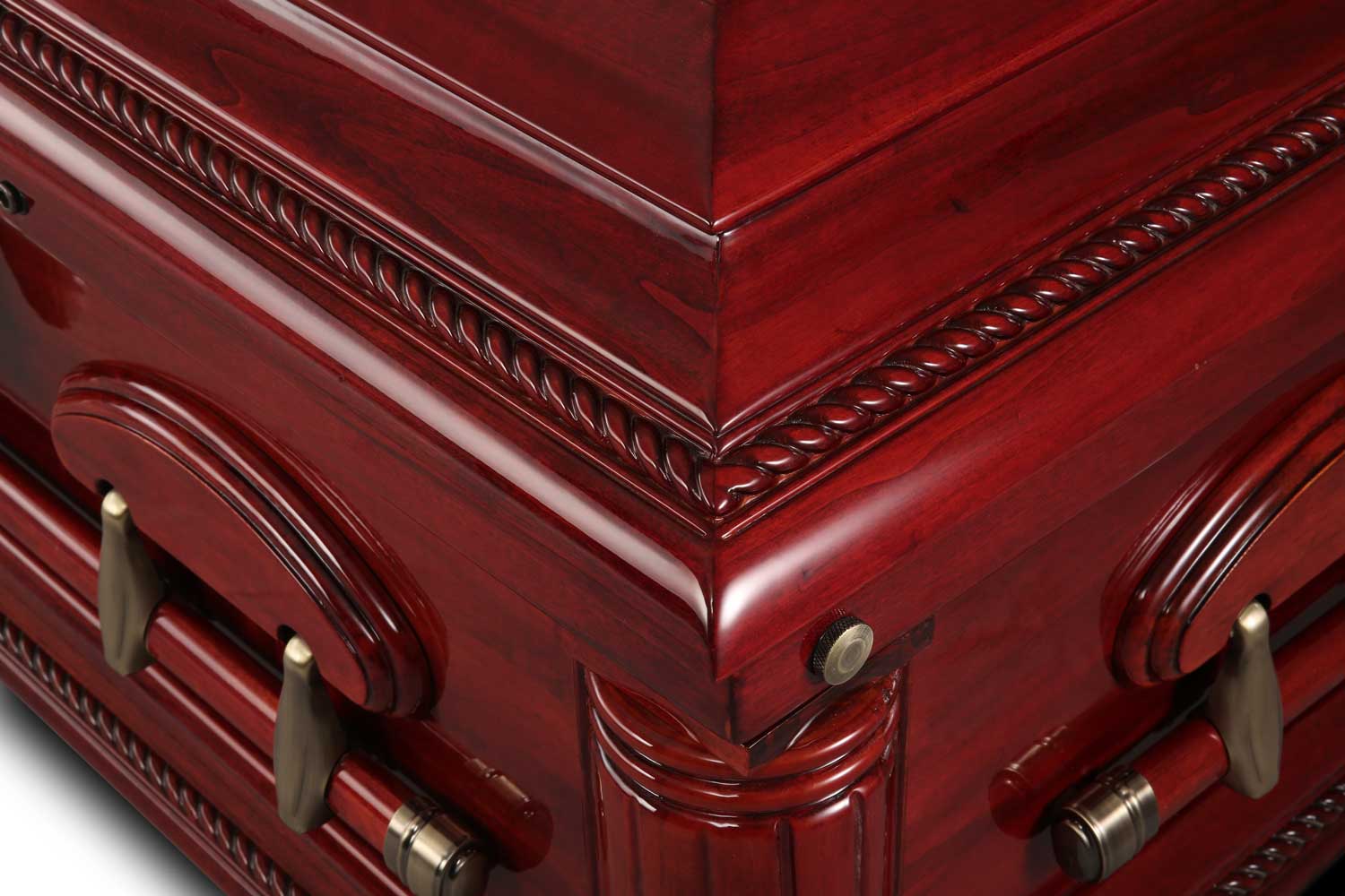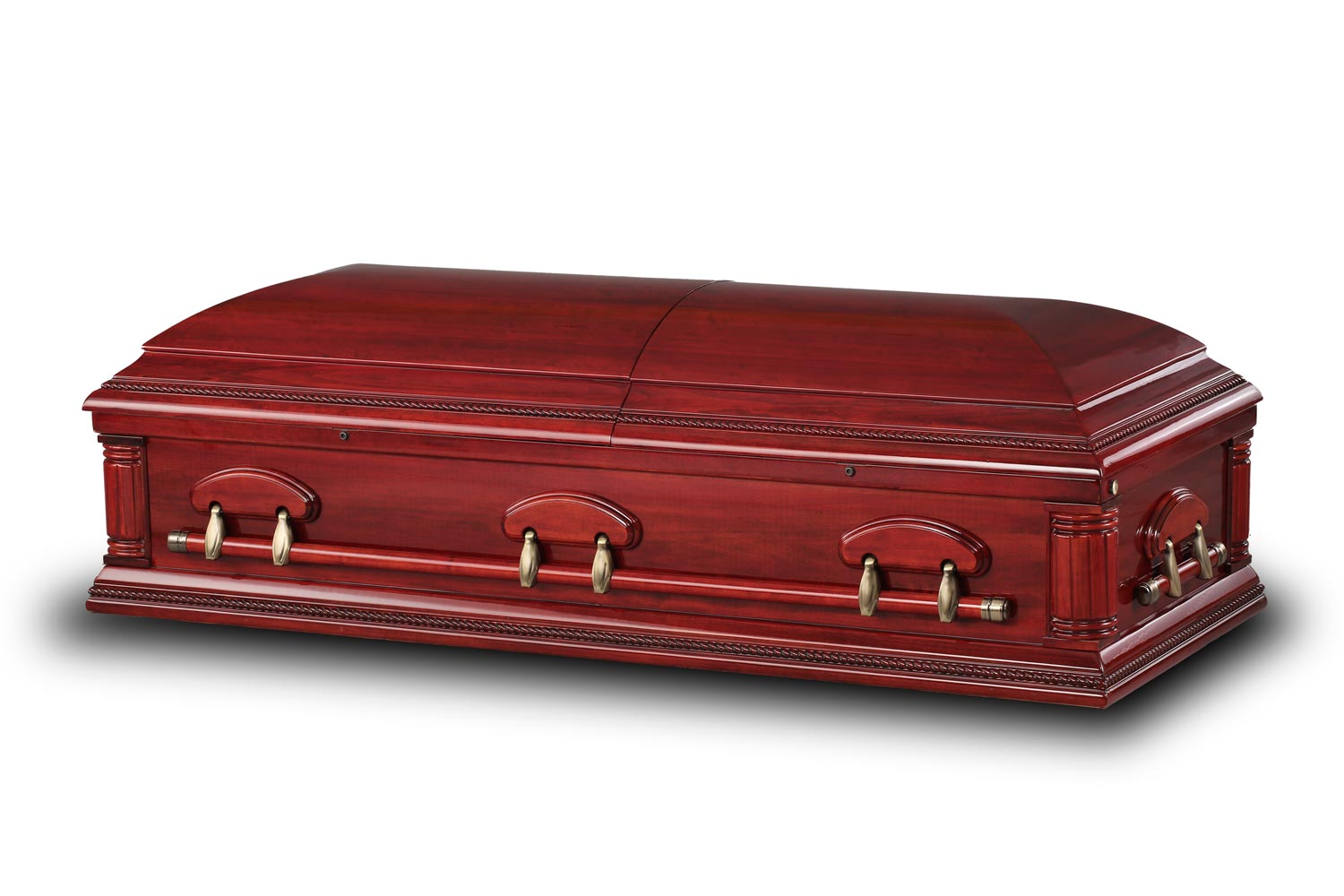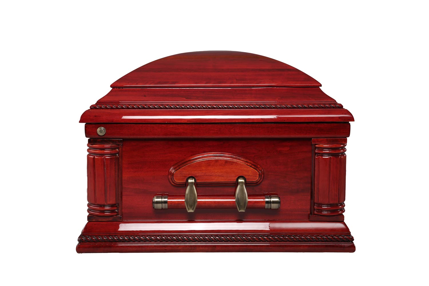 Bold yet timeless, this oversized solid poplar wood casket features a rich, high-gloss burgundy cherry finish, enhancing its depth and warmth. Antique brass hardware complements its stately design with a luxurious cream velvet interior.
